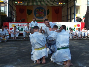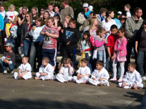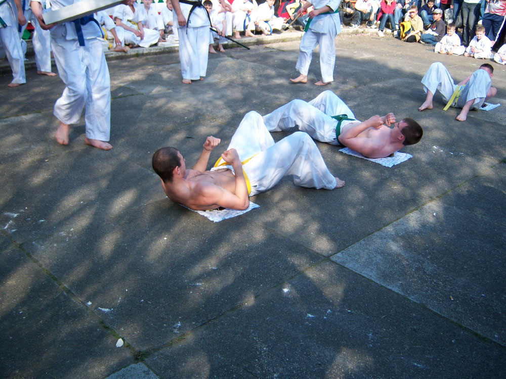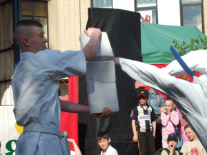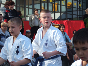 Diesmal hat unser Klub das Maximum der Zuschauer gesammelt – doch nahm an der halbstündlichen „Show“ fast der ganze Klub teil! Die Kleinen mit der ganzen Gruppe haben die Kata demonstriert, die sie bald in den Prüfungen abgeben werden, die mittlere Gruppe ist mit bruchtest zurechtgekommen – die Leute haben alle Bretter, wenn auch nicht immer vom ersten Versuch zerschlagen. Die mehr älteren Kämpfer schlugen die Betonblöcke – haben aller zerschlagen, aber einer der Kämpfer hat sich den Arm gebrochen… und am meisten älter haben des alle neue Kata mit den japanischen Schwerten – „Katana“ erfüllt. Eine Rosine der Aktion war es Bruchtest der Betons auf den Bauchen der älteren Kämpfer – Nikita, Artjom und Ronny, die auf den Gläsern von gerade erst müden Flaschen liegen. Ende „Show“ Sempai hat den Betonblock auf den Bauchen der Kleinen zerbrochen – Steven und Arthur. Aller sind lebendig, die Eltern – sind zufrieden, die Zuschauer – im Schock.