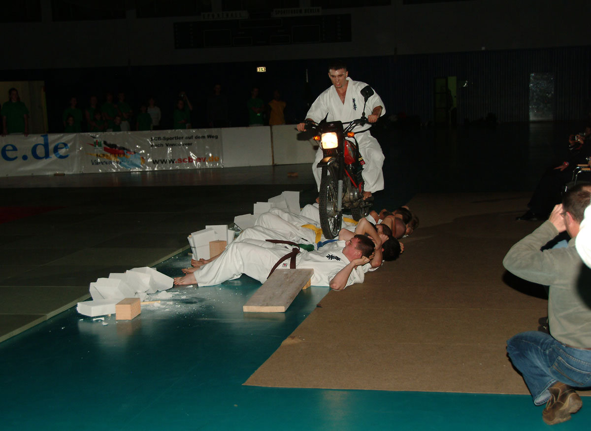 Кульминацией нашего выступления стал переезд на мотоцикле по животам сильнейших бойцов клуба (младшему – 10 лет)! Очевидцы рассказывали, что в зале случились истерики и обморок… Как бы там не было, все, начиная от малышей (младшим – только исполнилось 5 лет), справились со своими заданиями и в итоге наш клуб занял первое место! Приятно было получать поздравления от жюри вперемешку с восторженными отзывами.