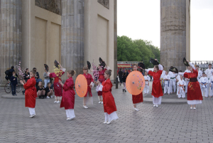 Девочки из Danzu открыли наше „Демо“ своим японским танцем, а мы продемонстрировали основные части каратэ Киокушин. Столько зрителей как в этот раз у нас ещё не было – все туристы и местные жители, находящиеся в тот момент на Паризер Платц, окружили наших ребят плотным кольцом. ОСУ всем, кто участвовал в нашей акции!