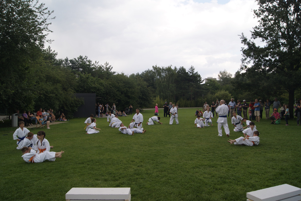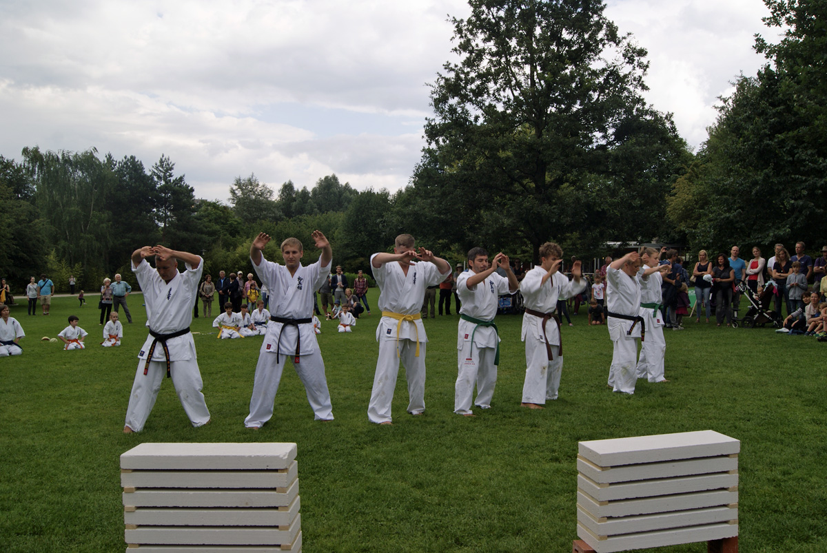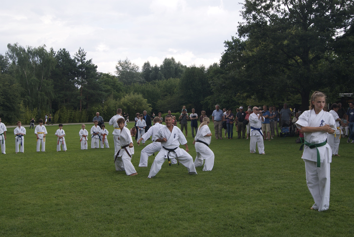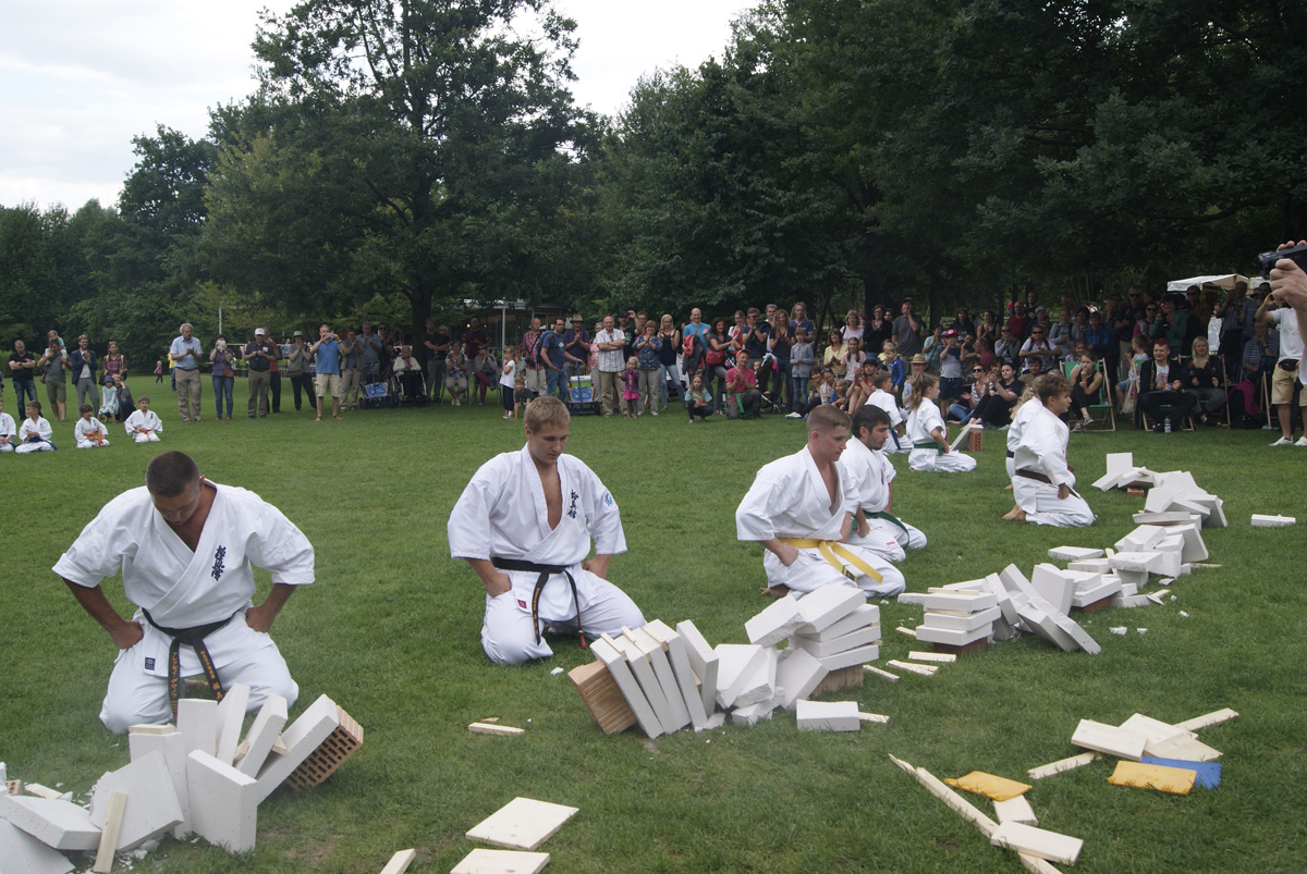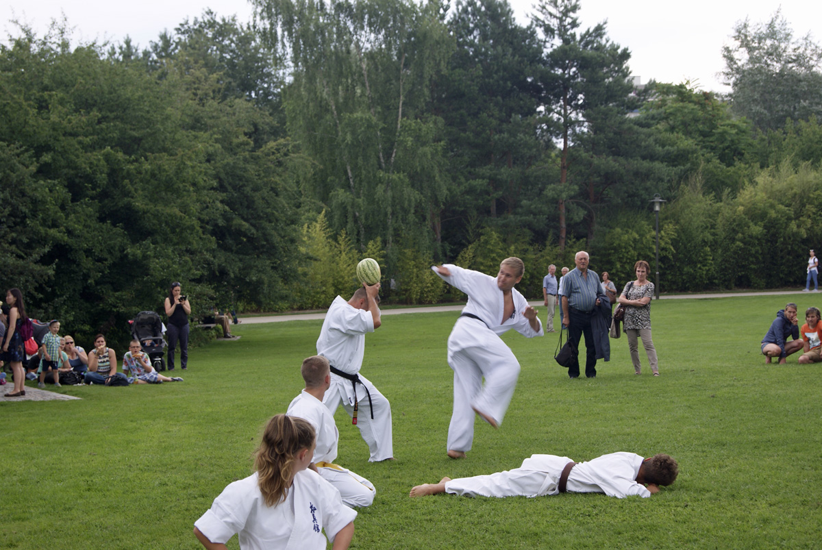 Самый красивый парк нашего города – „Gärten der Welt“ вместил в себя в эту субботу „красивый“ в плане организации праздник, самую „красивую“ в плане солнца и тепла погоду в этом месяце, и самых „красивых“ в плане техники бойцов школы DANKEZU! А когда у нас такое сочетание, то и выступление можно смело назвать „красивейшим“ в уходящем сезоне: все техники выполнены безукоризненно, разные ката сплелись в один рисунок, боевая техника произвела впечатление даже на охрану, ну а сломано было всего – восемь досок, две двухметровые палки, один арбуз и 36 (!) блоков!