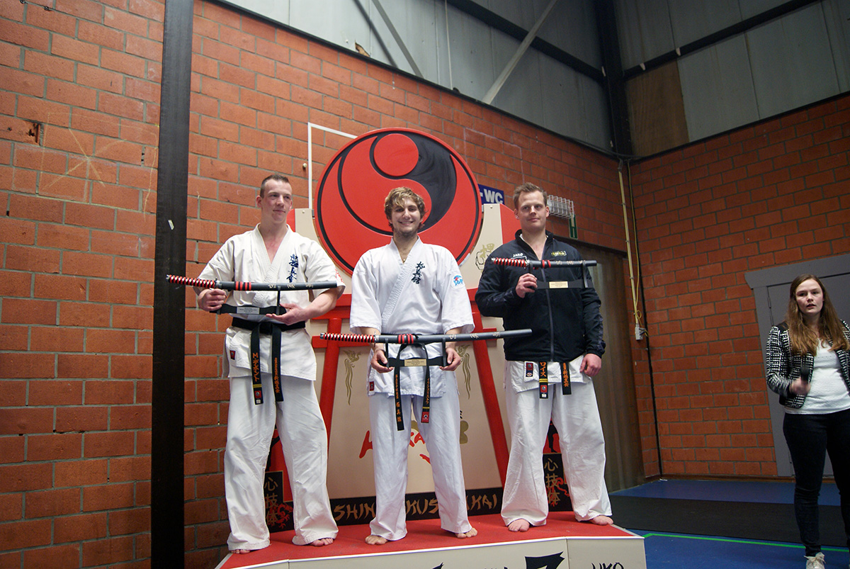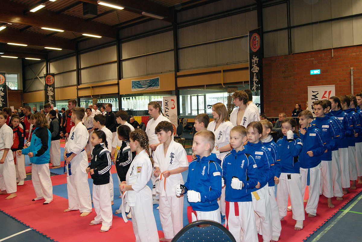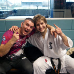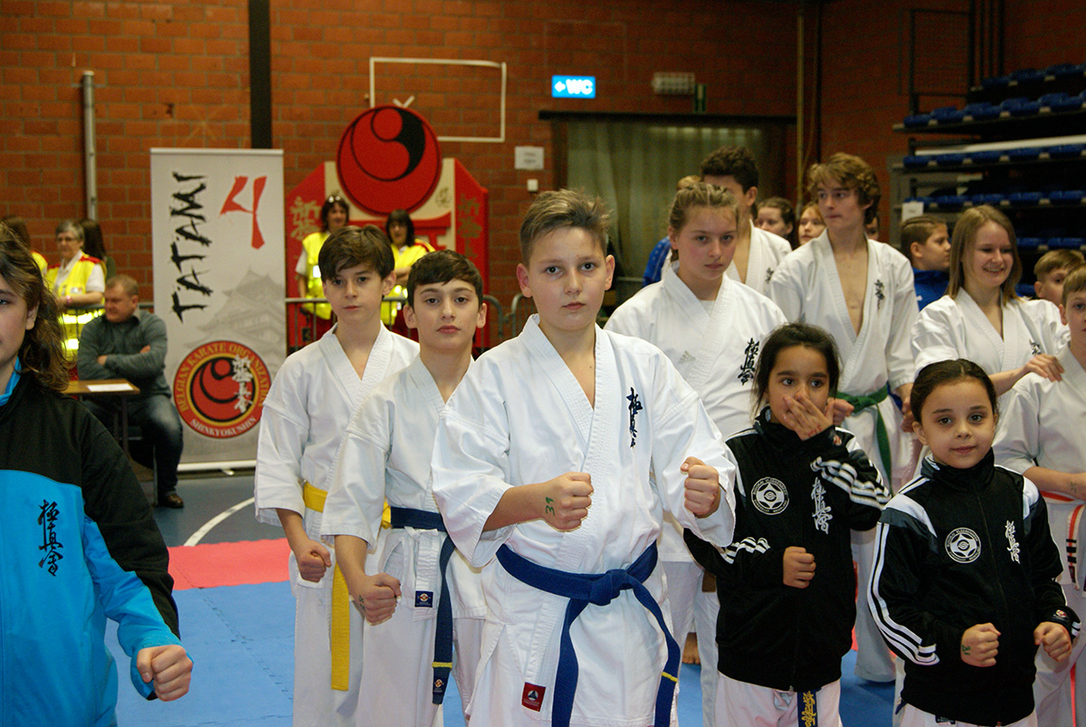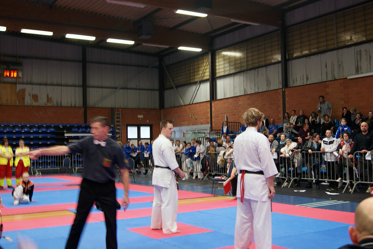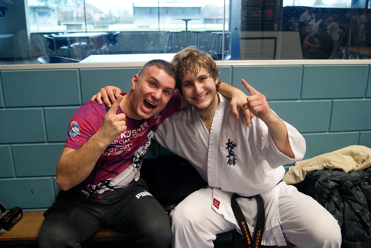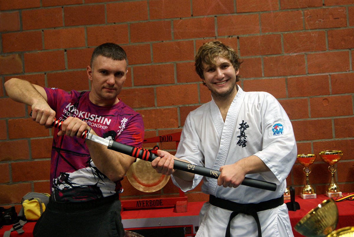 После обеда настало время нашего Сэмпая Ивана, который уже больше года не вставал на пьедестал в мужских категориях… Первый бой в полуфинале Ивану противостоял боец из Бельгии, с котором Сэмпай разобрался очень аккуратно, даже можно сказать аристократически – так технично и точно в цели ложились его удары, что он вызвал этим боем аплодисменты всего зала, закончив его с двумя вазари – шита цуки и тоби нидан гери в корпус. А вот в финале с нами встретился один из самых титулованных бойцов Бельгии, участник чемпионатов Мира и призер Европы. Тем сильнее была наша радость победы, когда Иван Деманов точным цуки в живот заработал первую оценку, а затем, под звуки поддержки всего зала „добил“ своего сильного соперника. Иван вновь чемпион! И это серьезная заявка на наши дальнейшие победы в каратэ киокушин!!! Очень приятно было наблюдать за первыми „автографами“ Ивана – дети разных стран подходили, просили сфоткаться, тренеры знакомились, бойцы поздравляли, жали руки…