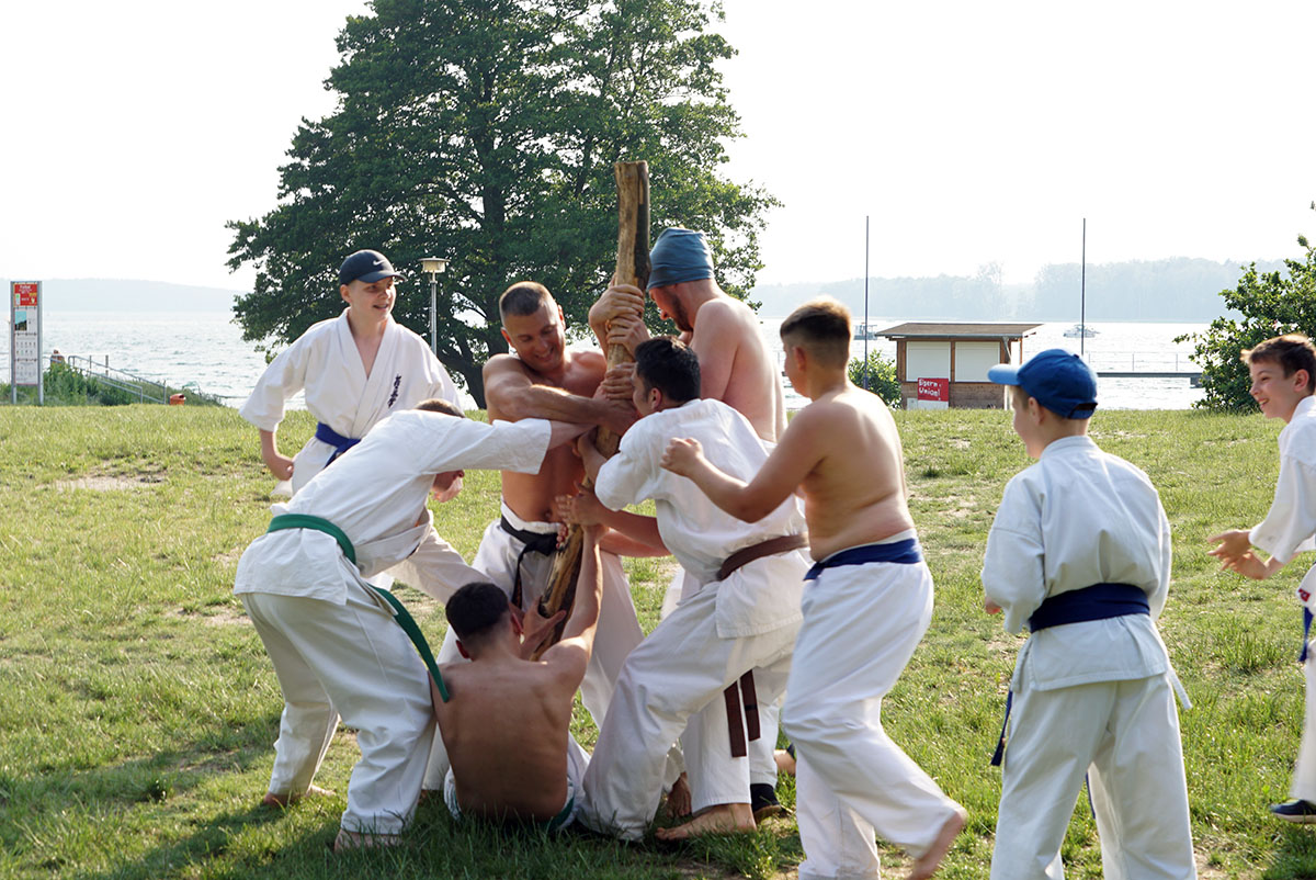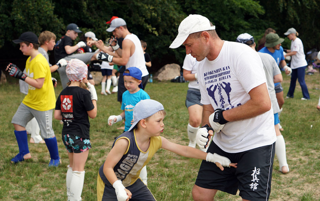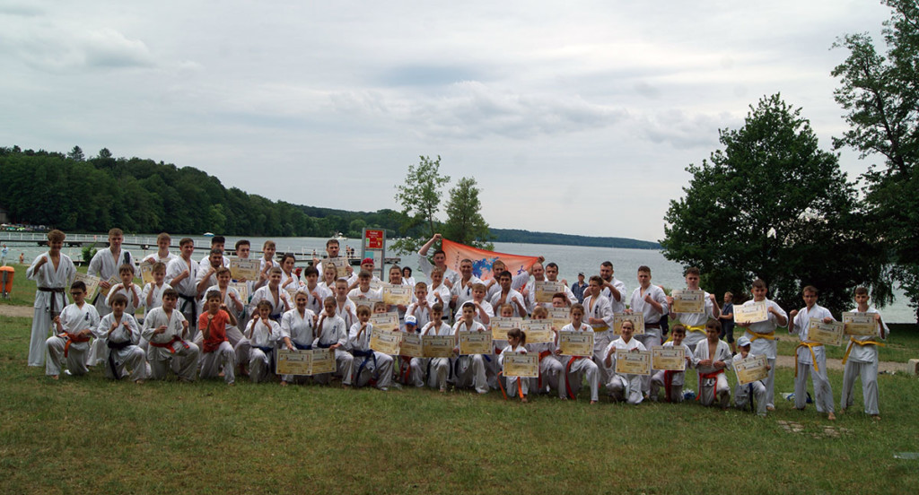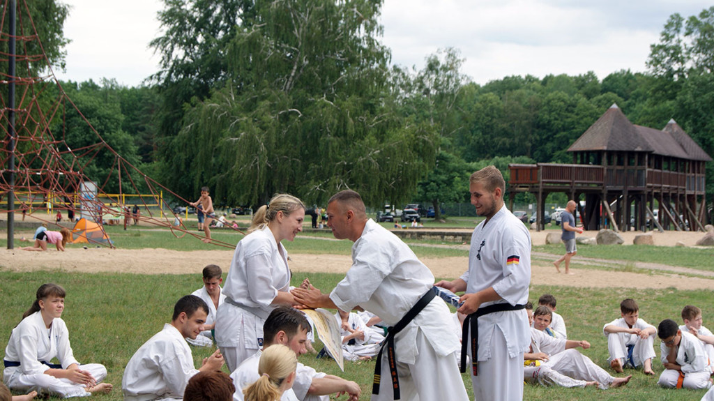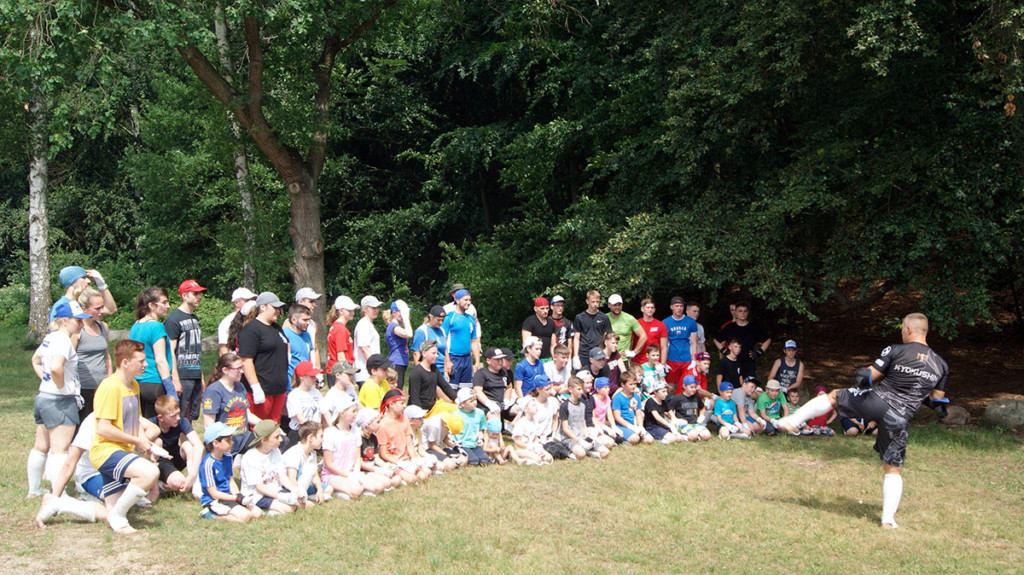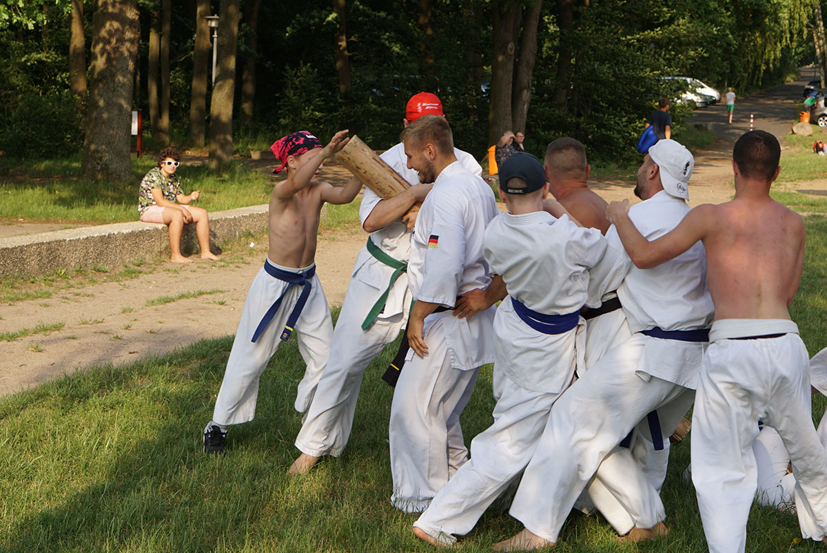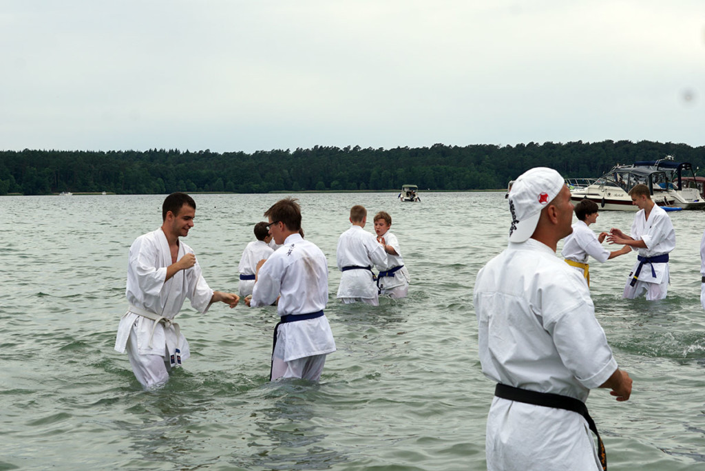 Ровно в середине июня мы провели наш традиционный лагерь в нашем любимом месте – на езере Вербеллин. В этот раз ровно 80 участников из трех различных федераций немецкого кикокушин прошли испытания в три дня. Работа с камнями и бревнами, „лестница-убийца“, растяжка на песке, ката и бункаи, Бо, спарринги и на суше и в воде, спортивные и специфические игры, теоретические занятия, медитация, психоанализ и пробежки – всё это мы успели за трое суток воплотить в жизнь. Ну, а „Starteen“ – танцевальный конкурс для всех, был поистине невероятным.