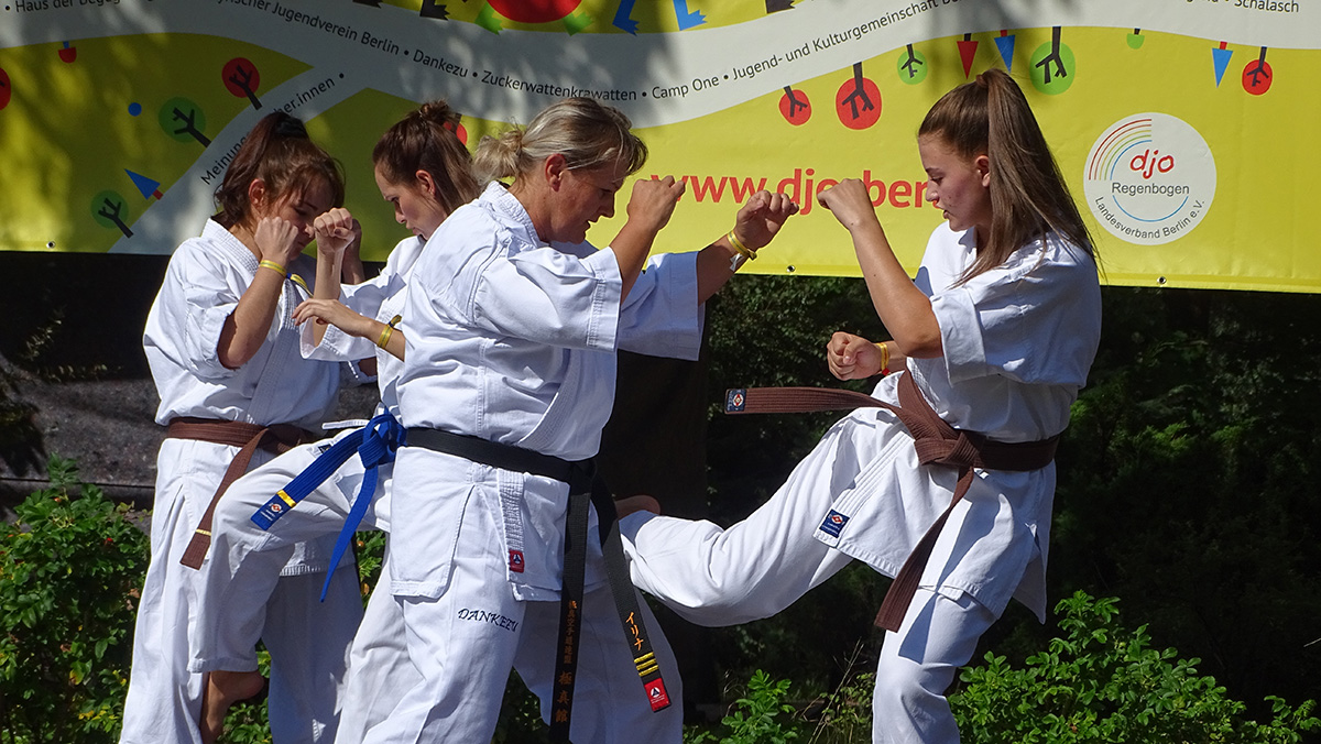 Ну, наконец-то что-то похожее на нашу „прошлую“ жизнь! Команда DJO-Regenbogen, которая нам помогает в течение долгого времени, провела праздник – Культурфест. Мы уже отвыкли, что можно без масок, соблюдения дистанции и ещё миллионов предписаний просто общаться, тренироваться, выступать… Тем приятнее были эти долгожданные дни и вечера – спасибо организаторам ещё раз! В этот раз наш DANKEZU представляли исключительно девушки. И получилось совершенно невероятно, классно и необычно. Лилия и Катерина влились в основной состав DANZU, и, практически без репетиций и подготовок выступили вместе с девочками на сцене с латиноамериканским танцем. Наши девушки провели мастер-класс по четырем разным направлениям танцев, а в конце ещё и все вместе продемонстрировали свои навыки в каратэ киокушин! Разбавьте всё это шикарной погодой, теплой водой в озере, вкусной едой и наши вечерними играми – вот что нам так не хватало долгие два года!