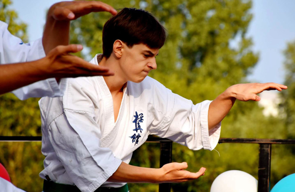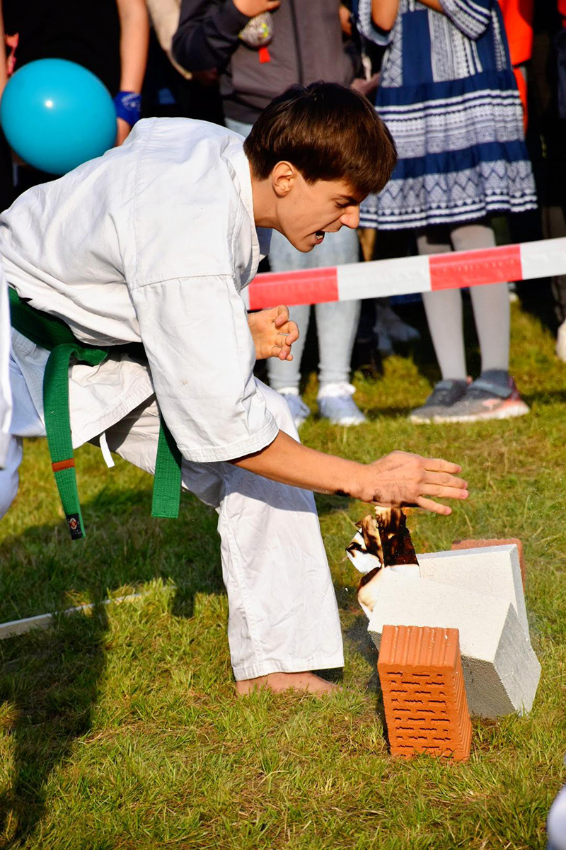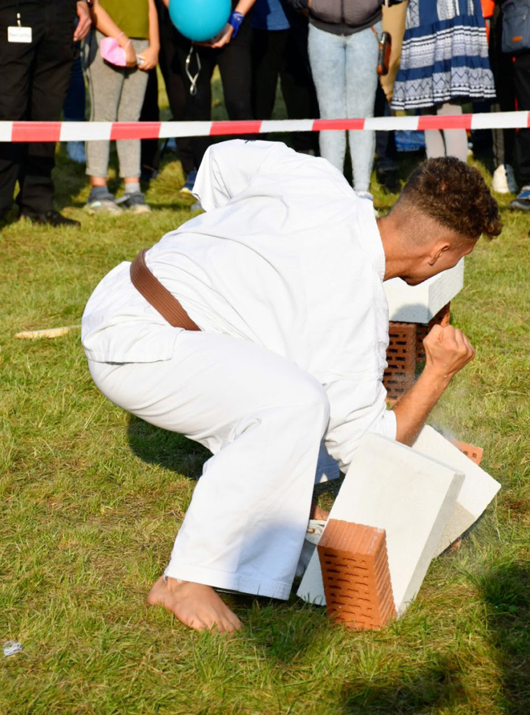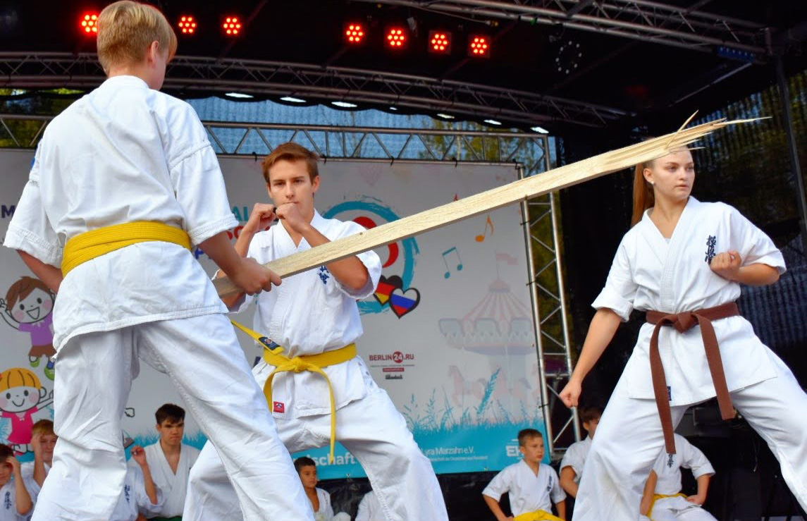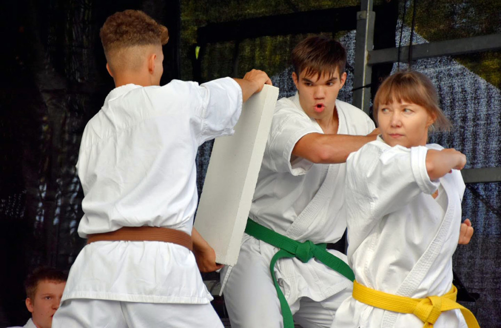 А вот ката наши ребята продемонстрировали как в лучшие времена, разбавляя их тамэсивари – ломали доски, палки, блоки… Старшие же ученики выполнили ката „Сэйенчин“ в зеркальном отражении друг друга и, спрыгнув со сцены, сломали толстые и горящие блоки всеми основными четырьмя частями ударными зонами – кентас, какато, хидзи и шуто. Разбили все!