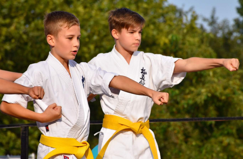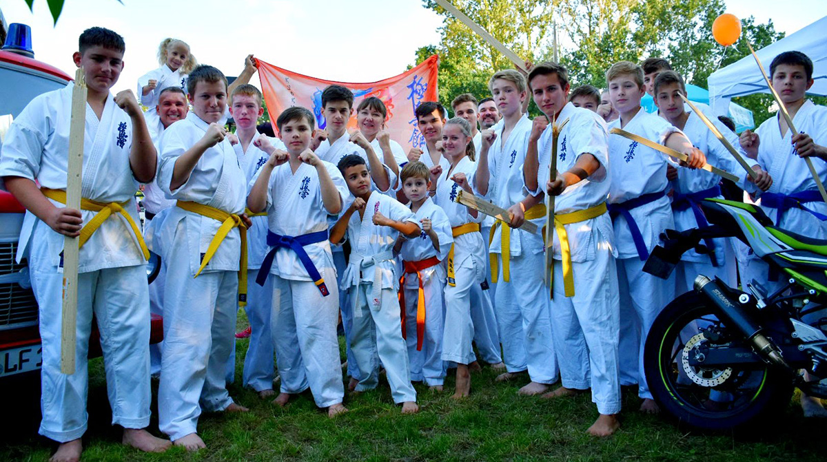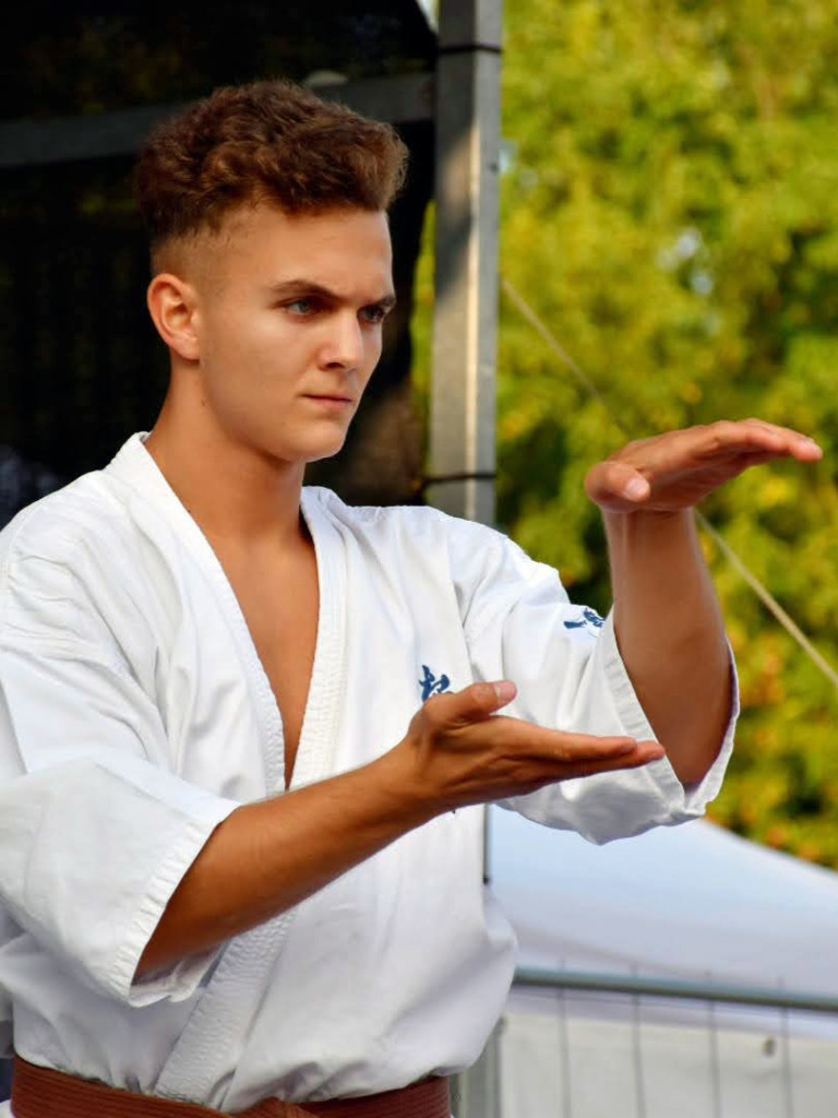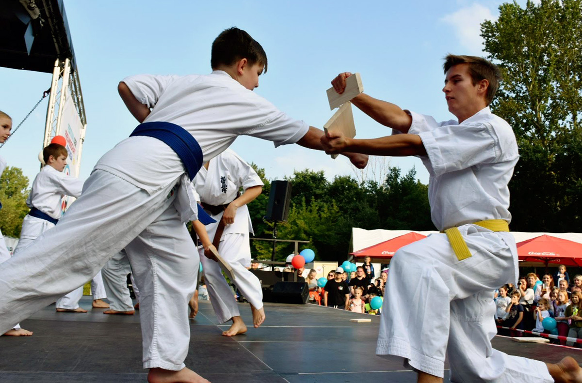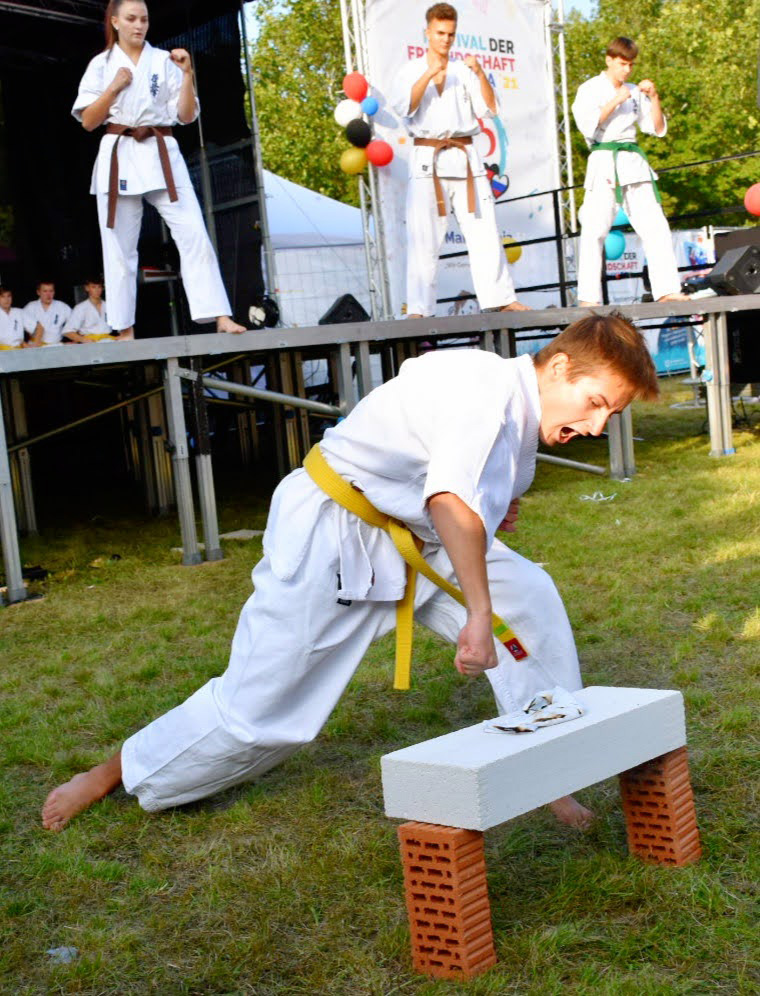 А вот ката наши ребята продемонстрировали как в лучшие времена, разбавляя их тамэсивари – ломали доски, палки, блоки… Старшие же ученики выполнили ката „Сэйенчин“ в зеркальном отражении друг друга и, спрыгнув со сцены, сломали толстые и горящие блоки всеми основными четырьмя частями ударными зонами – кентас, какато, хидзи и шуто. Разбили все!
