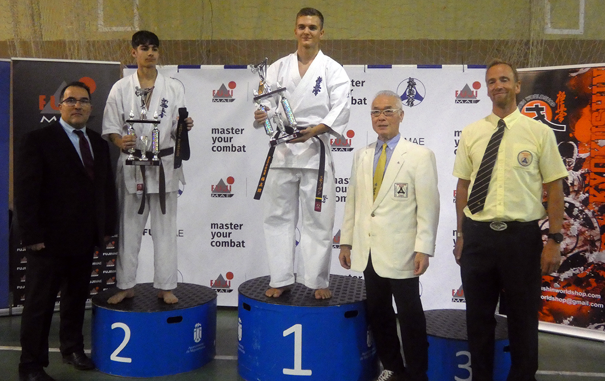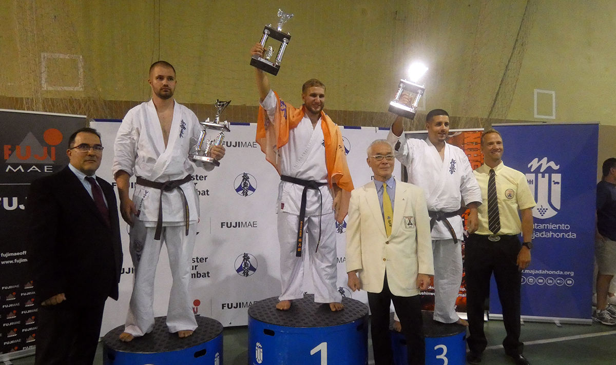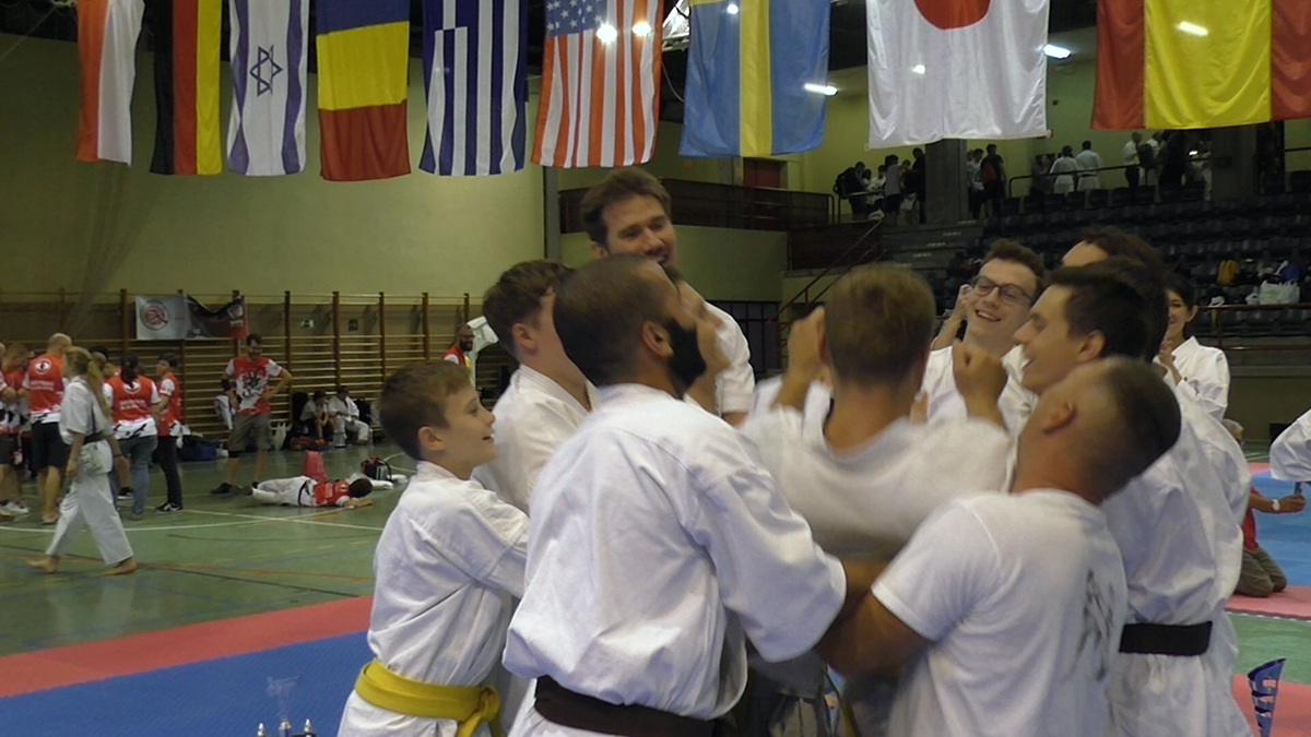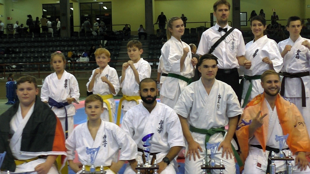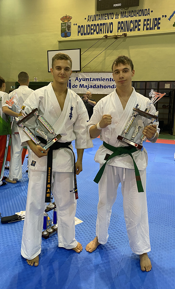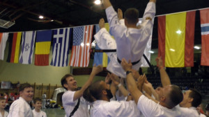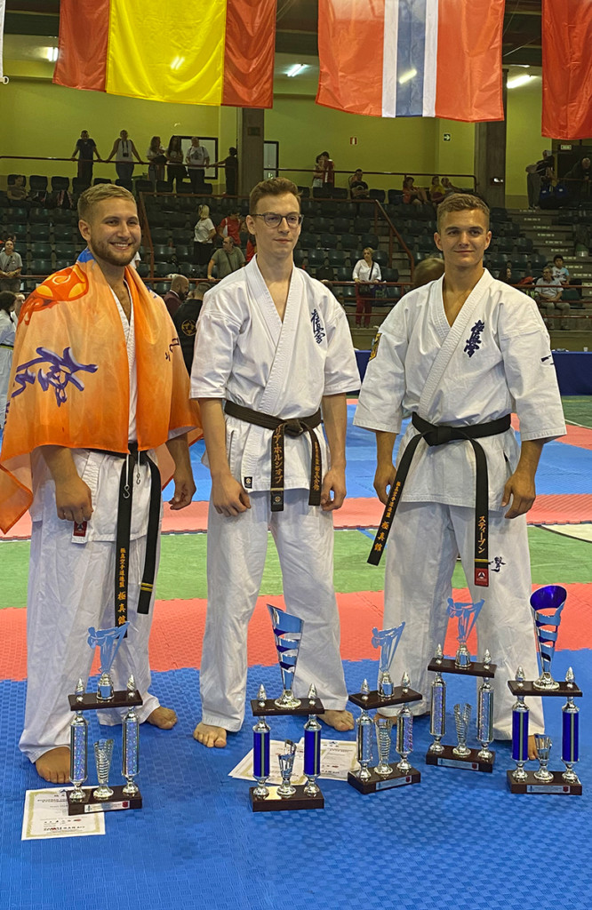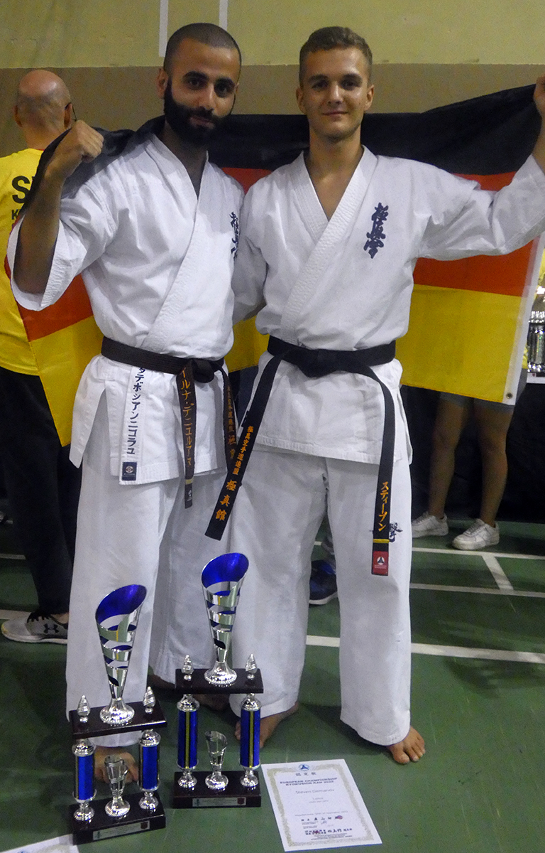 Почти все наши сборники по ката выполнили задачу минимум, которую мы поставили каждому индивидуально, и очень достойно впервые в своей спортивной карьере боролись за звания лучших по ката. Однако, чтобы победить в таком субъективном виде, как ката, мало было хорошо исполнить ката – поэтому, к сожалению, девушки остались без наград… Зато наши два парня порадовали на славу – Илья Горшков занял второе место среди юниоров 16-17 лет, а Стивен Деманов стал ЧЕМПИОНОМ Европы в мужской категории. После катистов вышли наши сборники по кумитэ – это были практически лучшие бойцы нашей школы на сегодня в разных возрастных и весовых категориях. Однако правила спортивного кумитэ у юношей и юниоров сводились к тому, что запретили бить в голову ЛЮБЫЕ техники ногами, оставляя нас без любимых „фишек“ и нашего оружия. В результате таких нововведений и судейских ошибок, не всем удалось реализовать своё превосходство на татами, и некоторые из наших парней остались без наград, или получили медали рангом ниже. Хорошо, что наши главные бойцы – братья Демановы расставили всё по местам – Сэмпай Иван стал чемпионом Европы в абсолютной мужской категории, а Стивен Деманов, поставил своеобразный рекорд не только нашей школы, но и всей страны – выиграв на одном чемпионате сразу ДВА титула чемпиона Европы, став сильнейшим по кумитэ!!! Спасибо тем, кто верил в нас и переживал, спасибо Герду и Юрию Киршу, которые поддержали, помогали, и практически участвовали в этом празднике. ОСУ!!!